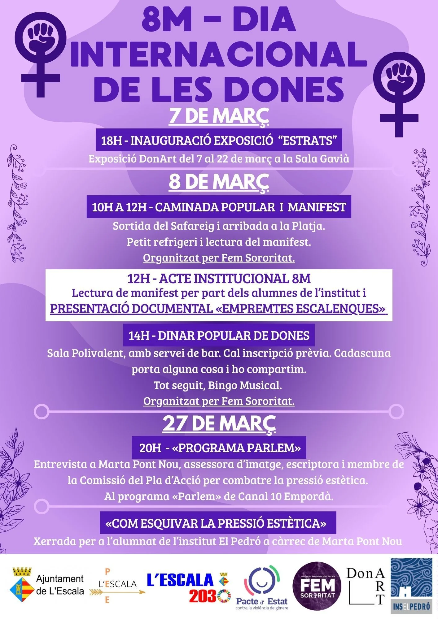 Amb motiu del Dia Internacional de les Dones, l'Ajuntament de l'Escala i l'entitat Fem Sororitat han ideat un programa d'activitats, que es desenvoluparà en el municipi del 7 al 27 de març. Una exposició al Gavià, una caminada popular, la lectura d'un manifest per part de l'alumnat d'El Pedró o un dinar de germanor a la Sala Polivalent són alguns dels actes que en formen part.